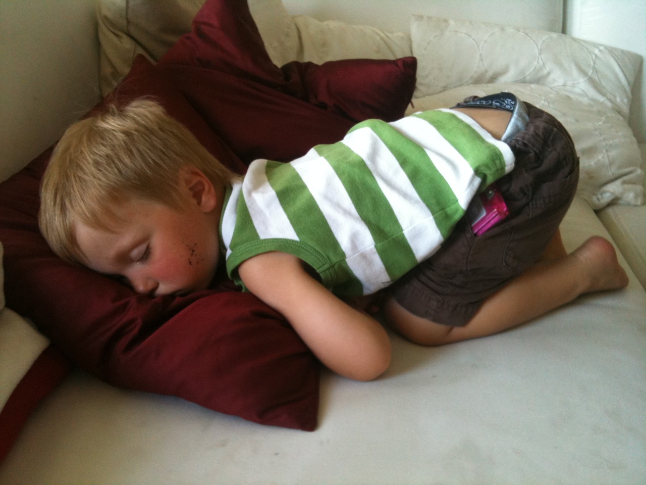 Oliver on lomalla ja saa tai saa olla menemättä päiväunille oman mielensä mukaan. Usein valitsee jälkimmäisen vaihtoehdon. Nyt hän kuitenkin pilkki sen verran vahvasti jo lounaalla, että kyselin, josko häntä väsyttäisi. ”Ei väsytä, enkä mene päiväunille!” oli selkeä vastaus. Muutama minuutti siitä hän kiitti, poistui pöydästä ja kuin vaivoin selvisi sohvalle asti. Ja lopputulos oli seuraavat pari tuntia kuvan mukainen. Ei väsyttänyt, ei…