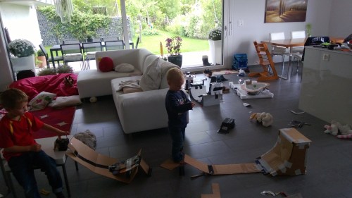 Oliver on rakentanut muuttolaatikoista, jesarista ja muropakkauksista parisen viikkoa miniskeittiparkkia olkkariimme. Eräänä aamuna hän herää ja katselee aikaansaannostaan: